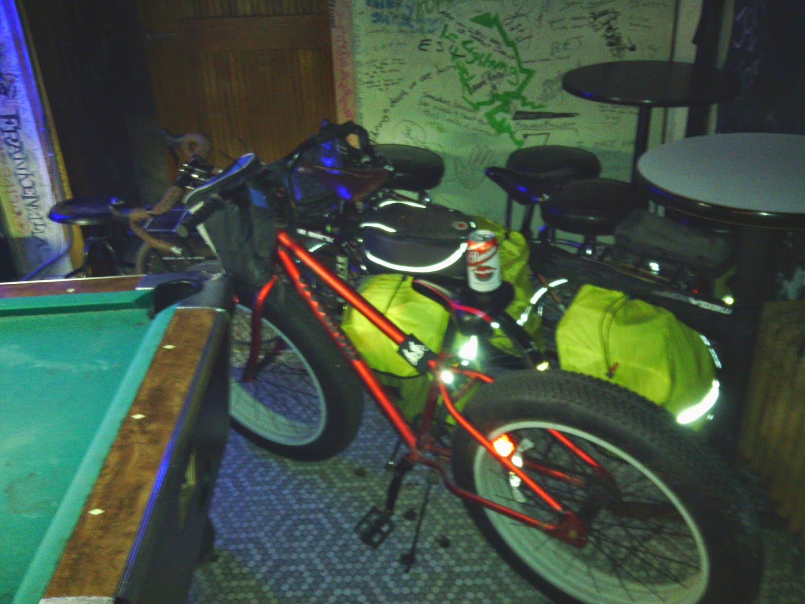 So grabbed the Beast, a pair of sunglasses, mobile and wallet. Ended up at the Locust Tap. 3 of us just beat the rain as a dark ominous black cloud wafted over like the aliens on Independence Day. The barkeep was kind and suggested that we bring the bicycles inside. We placed them by the pool table.